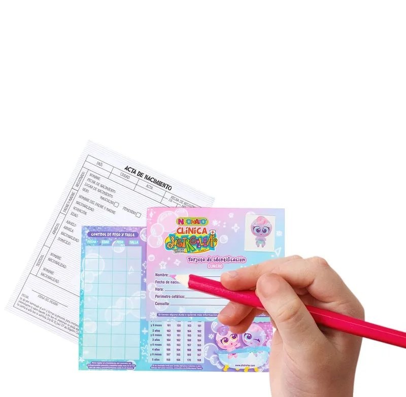 Contenido: 11 PIEZAS: 1 MUÑECO, 1 MAMILA, 1 ESPONJA, 1 MINI TOALLA, 1 CHUPÓN, 1 TINA, 1 ACTA DE NACIMIENTO, 1 IDENTIFICACIÓN CUNERO, 1 FOTO, 1 CARTILLA DE VACUNACIÓN, 1 INSTRUCTIVO DE JUEGO