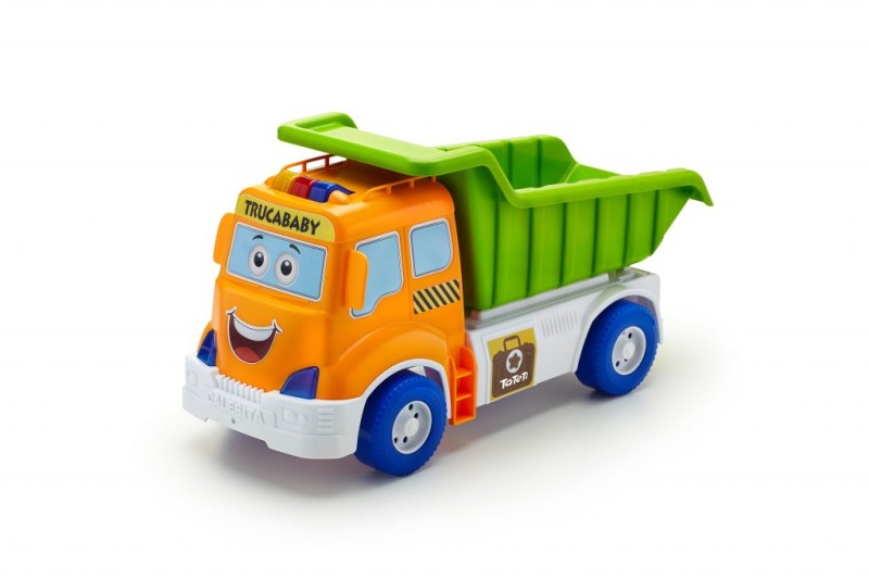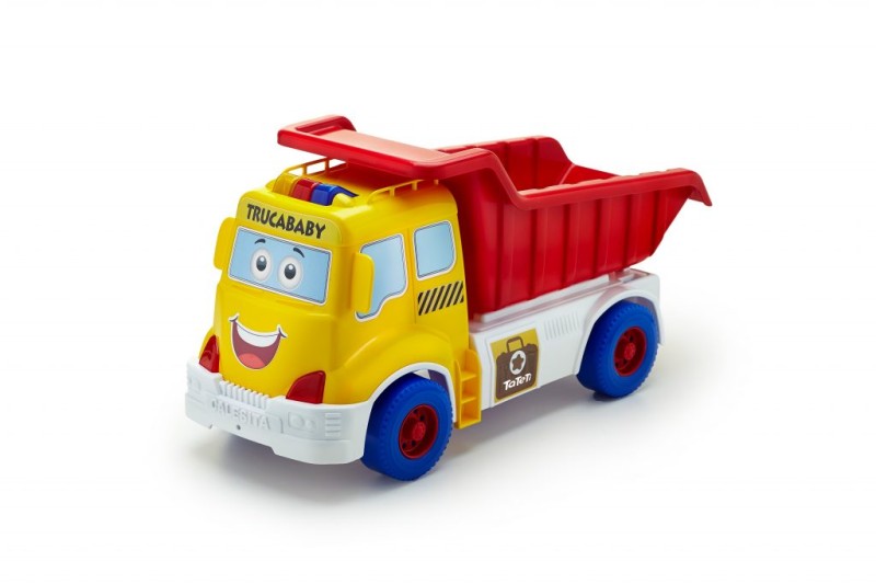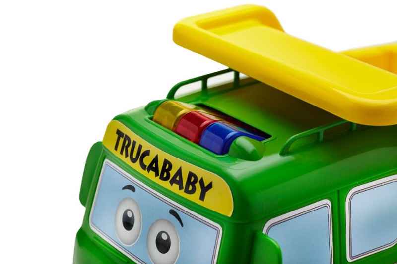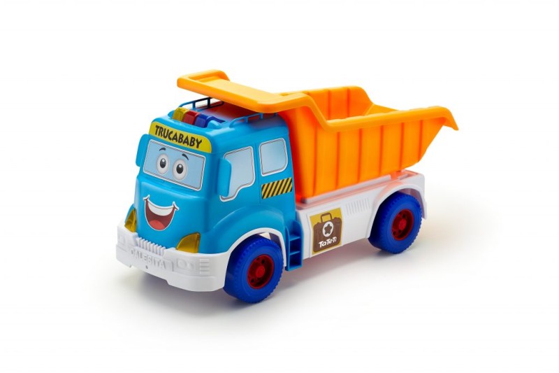 Para jugar en interior o exterior. Camión con cubo para llevar objetos pequeños, arena o guijarros, lo que importa es la diversión al jugar a simular. El Trucababy tiene llaves en la parte superior de la cabina que activan melodías y cuando suenan los sonidos, los faros se encienden.